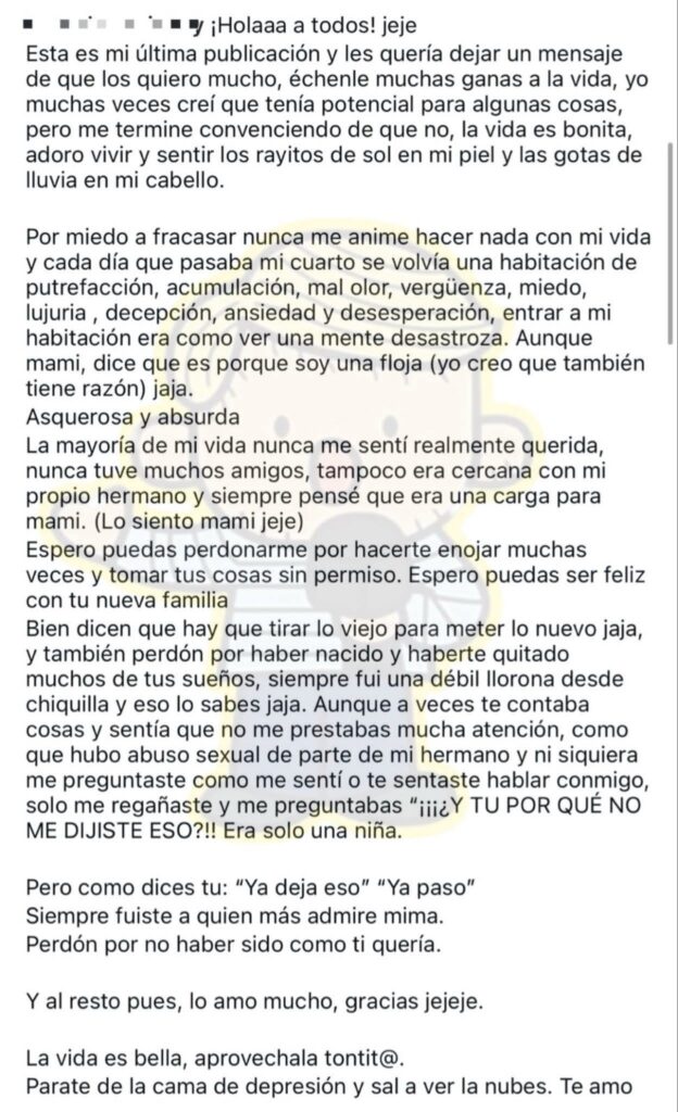 De acuerdo con reportes de la Fiscalía General del Estado de Puebla (FGE), la joven publicó previamente un mensaje de despedida en sus redes sociales en el que reveló haber sido víctima de abuso sexual por parte de su hermano y manifestó sentirse ignorada por su familia. Testigos señalan que minutos antes del suceso la víctima estaba en comunicación telefónica con su pareja, quien alertó a las autoridades. Sin embargo, los servicios de emergencia no llegaron a tiempo para evitar la tragedia.