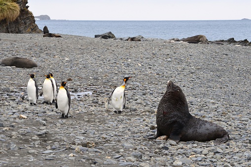 En una playa rocosa con el océano de fondo, cinco pingüinos rey caminan junto a una foca antártica en la isla principal de Georgia del Sur. istockphoto