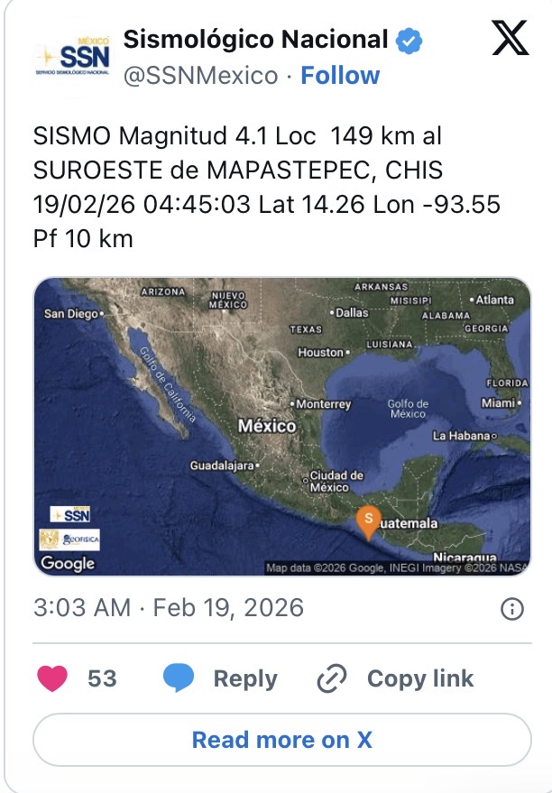 Un sismo de magnitud 4.1 fue registrado este 19 de febrero de 2026 al suroeste de Mapastepec, en el estado de Chiapas, según reportó el Servicio Sismológico Nacional (SSN). El movimiento telúrico ocurrió durante la madrugada y forma parte de la actividad sísmica constante que se monitorea en el país.