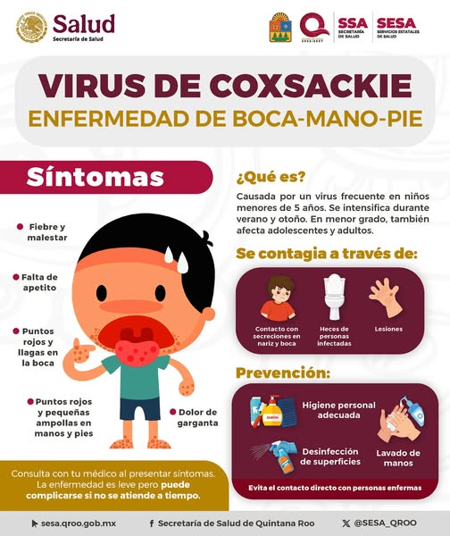 El virus es altamente contagioso en el entorno infantil. Los síntomas comunes incluyen fiebre, dolor de garganta y salpullido en manos, pies y boca. Si bien es una enfermedad autolimitada que generalmente desaparece en una semana o dos, su rápida transmisión puede saturar los servicios médicos y generar pánico innecesario en la comunidad.